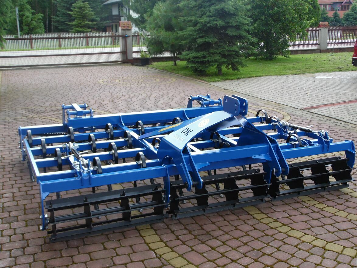 Oferuję do sprzedaży agregat uprawowy APOLLO Kompakt AUAC 18 z wałkiem z przodu strunowym- płaskownikowym φ350, Z tyłu wał strunowy zębaty jednosekcyjny φ320x2 renomowanej firmy Dziekan działającej od kilkudziesięciu lat na rynku krajowym i europejskim, znanej z produkcji różnego rodzaju innowacyjnych maszyn rolniczych wykonanych profesjonalnie i z wysokiej jakości materiałów.Agregat uprawowy APOLLO Kompakt typu AUAC 18 to czterobelkowy kultywator uprawowy (zęby sprężynowe lekkie), do którego z przodu zamontowano wał płaskownikowy gładki skręcony, zbudowany z przetłaczanych talerzy wału i rur o całej długości wałka, służący jednocześnie do płynnej regulacji głębokości pracy agregatu. Z tyłu zaś kultywatora zamontowano sekcję krusząco- ugniatającą zbudowaną z dwóch rzędów wałów strunowych zębatych lewo i prawo skrętnych wzmacnianych o średnicy φ320mm, pełnych przetłaczanych talerzach wału, rur o całej długości wałka i posiadających osiem strun zębatych. Do regulacji nacisku pracy podwójnych tylnich wałów strunowych zastosowano układ przegubowy z rozwiązanie zastrzeżonym w UPRP. Dzięki takiej kompaktowej budowie agregat zmniejszył swoją długość przez co środek ciężkości agregatu przesunął się w kierunku ciągnika, co jest szczególnie ważne do ciągników o mniejszej masie.